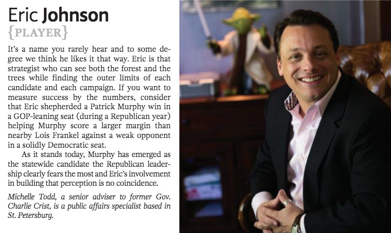 Johnson Strategies Eric JohnsonEric Johnson was recognized as one of the most influential people in Florida politics by Campaigns and Elections Magazine and was selected as one of the 100 most influential people in Florida by Influence Magazine in both 2016 and 2018. He has over 30 years of political and government experience in Washington, DC and Florida at the local, state, and federal levels.